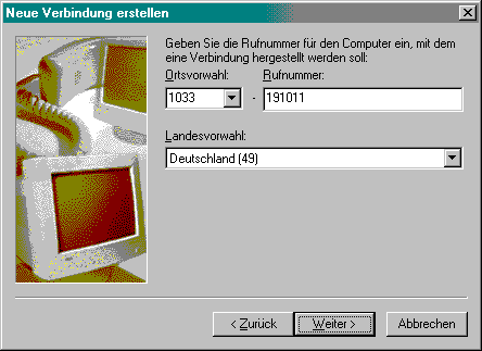 [ << Zurück ] [ Inhalt ] [ Weiter >> ] 4. Zielrufnummer eingebenGeben Sie die Rufnummer Ihres Internetdienstanbieters oder Onlinedienstes ein. Die Angaben zu den Vorwahlnummern müssen dabei den Wahlparametern aus der Systemsteuerung (Option Telefonie) entsprechen, damit diese je nach Standort nicht mit gewählt werden. Windows fügt der Rufnummer bei Bedarf automatisch führende Nullen hinzu. Ist Ihr Dienstanbieter ohne Vorwahl zum Ortstarif erreichbar, können Sie später die Verwendung der Vorwahlen noch explizit deaktivieren und auch die Rufnummer noch einmal anpassen. Wenn Sie T-DSL verwenden, können Sie eine beliebige Rufnummer (z.B. 1) verwenden. Sie wird vom DSL-Adapter ignoriert. Bei einem Zugang via GPRS geben Sie *99***1# als Einwahlnummer an. Das Mobiltelefon entnimmt dann alle erforderlichen Informationen dem ersten im Handy abgelegten (meist voreingestellten) Profil. Wenn Sie eigene Zugangsdaten (APN, DNS, usw.) übergeben möchten, müssen Sie *99# als Zugangsnummer angeben.